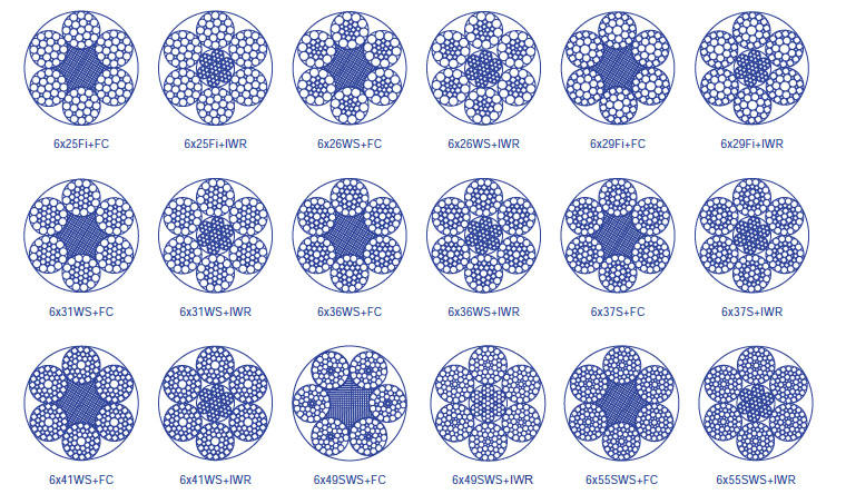 繩結(jié)構(gòu): 6×25Fi+FC 6×25Fi+IWR 6×26WS+FC 6×26WS+IWR 6×29Fi+FC 6×29Fi+IWR 6×31WS+FC 6×31WS+IWR 6×36WS+FC 6×36WS+IWR 6×37S+FC 6×37S+IW R 6×41WS+FC 6×41WS+IWR 6×49SWS+FC 6×49SWS+IWR 6×55SWS+FC 6×55SWS+IWR